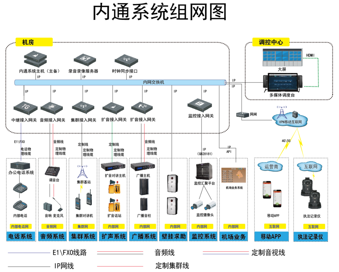 内通系统建设,充分利用已建成的公共电话交换网、计算机网络、公众移动通信网络,互联网,整合有线、无线通信一体化的多媒体综合调度系统。主要用于支持日常工作联络、突发事件应急处置时话音、数据等业务的传送需要,其余通信网为辅的安全畅通的通信网络。为供航站楼、各业务部门之间指挥调度、相互通信使用。
